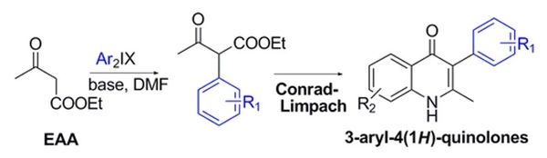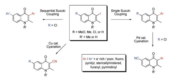 Divergent route to access structurally diverse 4-quinolones via mono or sequential cross-couplings.